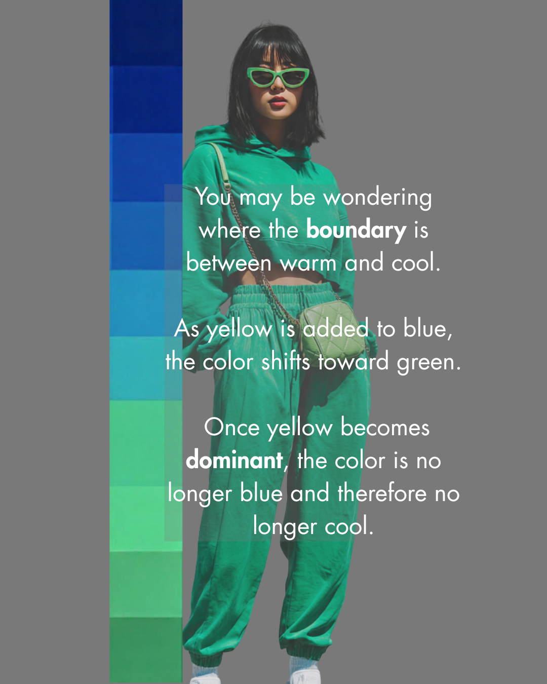 But the second yellow becomes dominant? That blue shifts toward green. And once it shifts toward green, it’s no longer a true blue—and no longer cool.